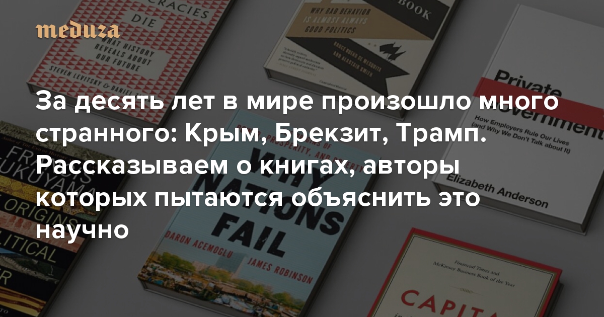 За последние десять лет мир стал другим. Многие события, пришедшиеся на 2010-е годы, было невозможно предсказать — от войны в Сирии, считавшейся одной из самых стабильных стран Ближнего Востока, до избрания президентом США эксцентричного шоумена с националистическими взглядами и бизнес-подходом к политике. Самое главное, что серьезно поменялись настроения в обществе — по крайней мере, в западном. Привычный способ понять, что происходит, — обратиться к ученым, исследования которых призваны описывать общественные процессы и тенденции. Правда, не всегда бестселлеры, оказывающие наибольшее влияние на научную дискуссию, помогают ответить на конкретные злободневные вопросы. Специально для «Медузы» кандидат политических наук Иван Григорьев из НИУ ВШЭ (Санкт-Петербург) подготовил подборку главных общественно-политических книг десятилетия, которые из-за своего влияния уже стали почти классическими (не всегда, правда, понятно, справедливо ли).