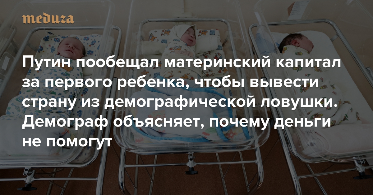 Путин пообещал выплачивать материнский капитал за первого ребенка, чтобы вывести страну из демографической ловушки Демограф Анатолий Вишневский объясняет, почему деньги не помогут