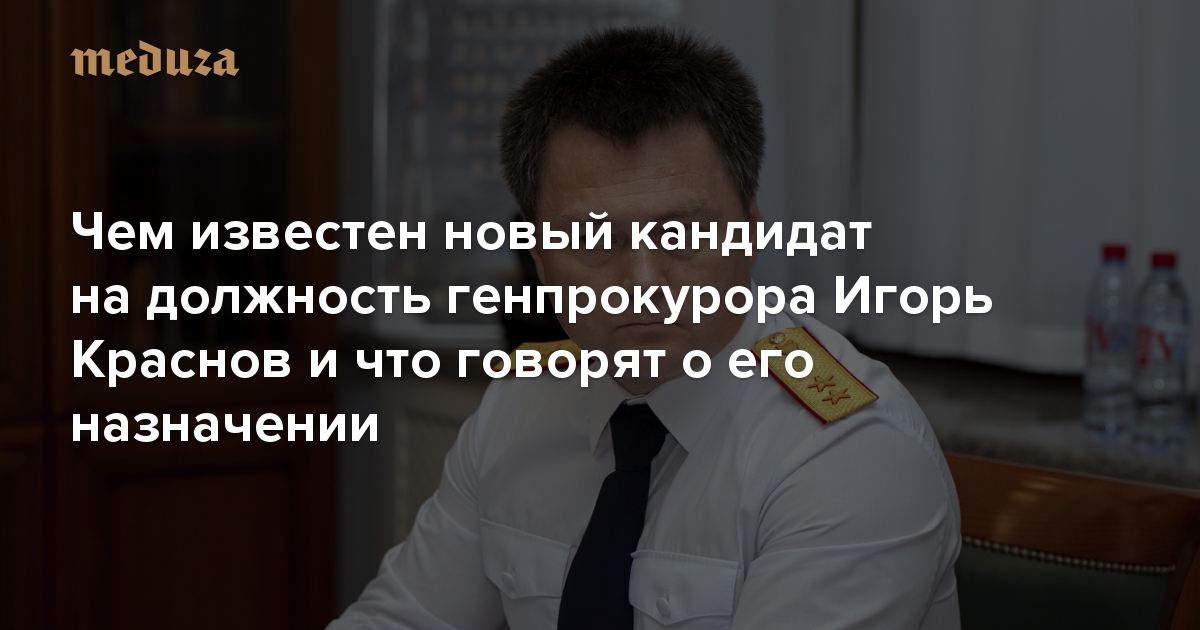 20 января 2020 года президент внес на утверждение Совета Федерации кандидата на должность генерального прокурора Игоря Краснова — известного громкими делами высокопоставленного сотрудника Следственного комитета. Его называют заслуженным профессионалом и союзником генералов, курирующих на Лубянке политический блок. Корреспондент отдела расследований «Медузы» Максим Солопов рассказывает, чем известен кандидат на должность Юрия Чайки, в отличие от своего предшественника не отметившийся в громких коррупционных скандалах и вообще непубличный человек.