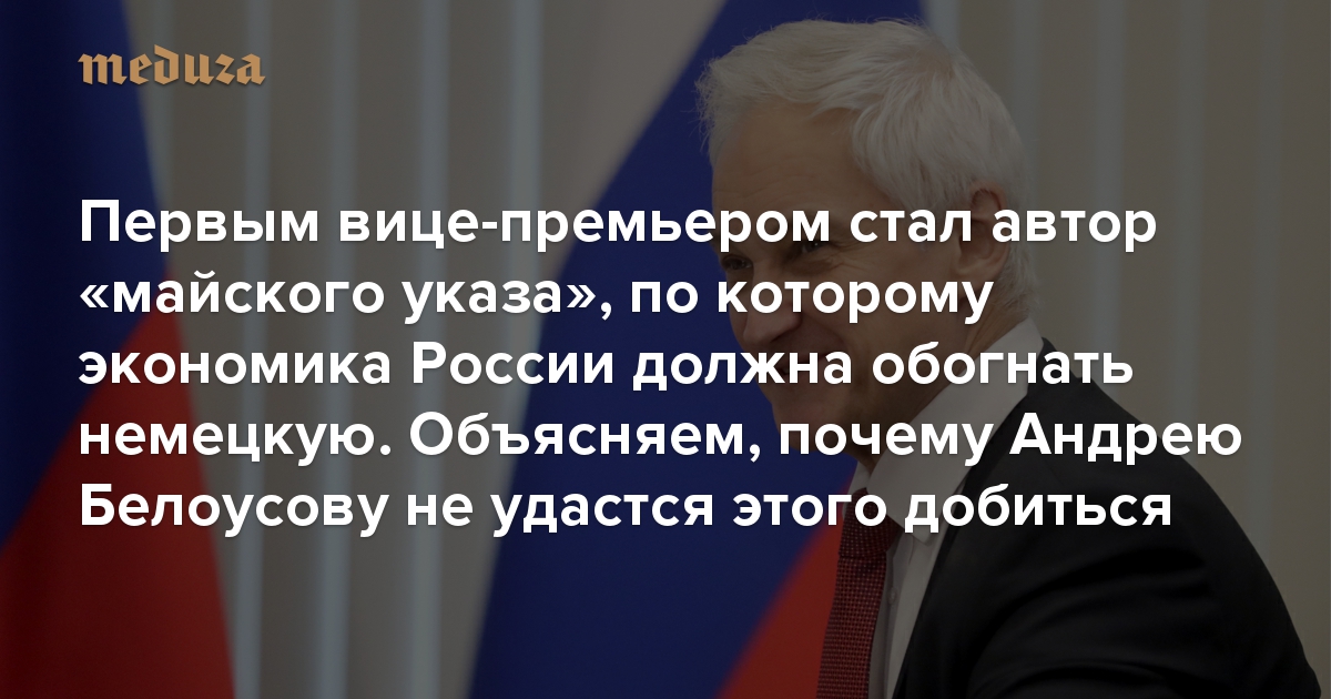 Андрей Белоусов, назначенный первым вице-премьером правительства, был одним из авторов «майского указа» Владимира Путина от 2018 года, который велел правительству сделать Россию пятой экономикой в мире, проведя модернизацию всей страны. Предыдущее правительство за полтора года в этом не преуспело и было уволено. Теперь достижением этой цели будет заниматься сам Белоусов, который готовился к этому с 2000-х. «Медуза» разобралась, есть ли у него шансы на успех.