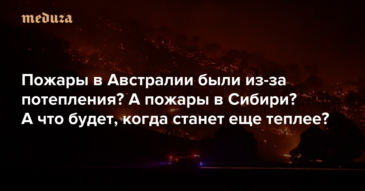 В Австралии эти споры уже вышли за пределы сообщества ученых и обсуждаются местными политиками — что еще больше запутывает достаточно сложный вопрос. В России, где свежи воспоминания о прошлогодних сибирских пожарах, а новый сезон возгораний наступит уже через пару месяцев, дискуссия сопровождается еще и резко выросшей активностью климатичеких «скептиков», которые отрицают само существование антропогенного воздействия на климат, не то что его последствия. «Медуза» пытается разобраться, что на данный момент известно о связи между потеплением и пожарами, что остается предположительным и что думают сами ученые о будущем пожаров в Австралии, Сибири и вообще на планете.