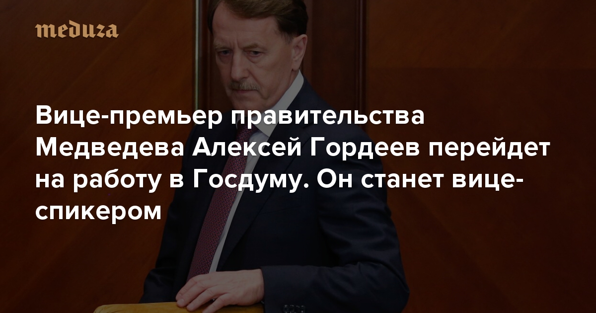 Бывший вице-премьер Алексей Гордеев, который курировал в правительстве Дмитрия Медведева сельское хозяйство, станет вице-спикером Госдумы. Об этом корреспонденту «Медузы» рассказали два близких к нему человека, информацию подтвердил собеседник в нижней палате парламента.