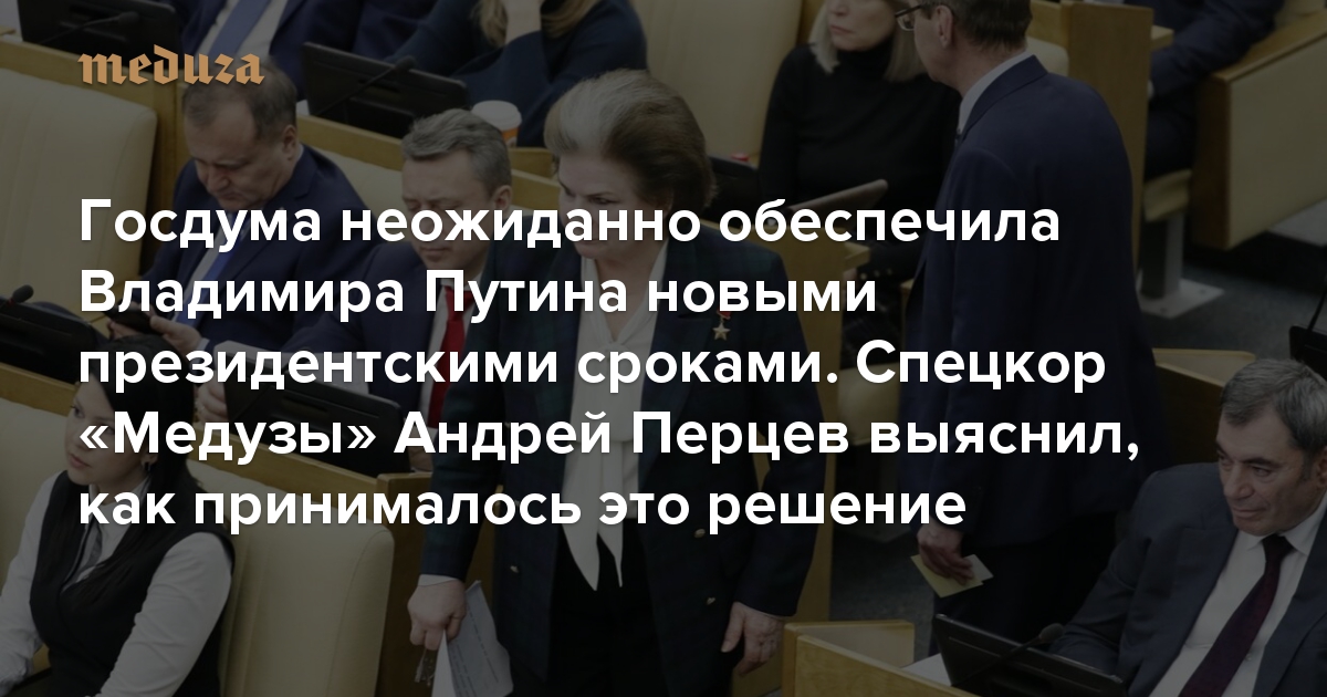 Госдума неожиданно для себя обеспечила Путина новыми президентскими сроками Спецкор «Медузы» Андрей Перцев выяснил, как принималось это решение