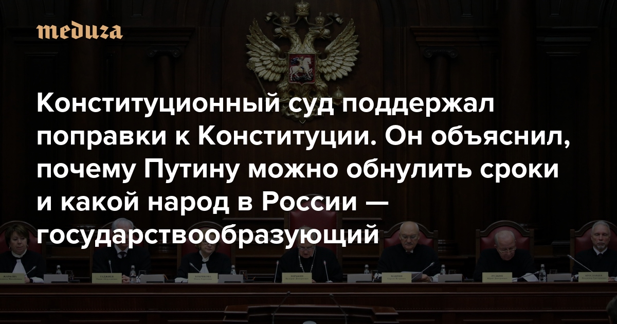 Судьи Конституционного суда РФ за двое суток проверили и признали конституционным закон о поправках к Конституции, а также одобрили процедуру его принятия. Суд объяснил, какие есть основания для обнуления президентских сроков Владимира Путина, почему отказ от однополых браков нельзя считать дискриминацией — и зачем нужно признавать русских государствообразующим народом. Решение суда было ожидаемым: 11 из 15 судей в КС назначены по предложению Путина, он же выдвинул в председатели нынешнего главу суда Валерия Зорькина. Вот главное, о чем говорится в 52-страничном заключении суда.