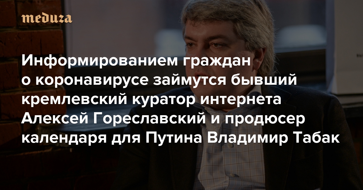 Информированием граждан о коронавирусе займутся бывший кремлевский куратор интернета Алексей Гореславский и продюсер календаря для Путина Владимир Табак