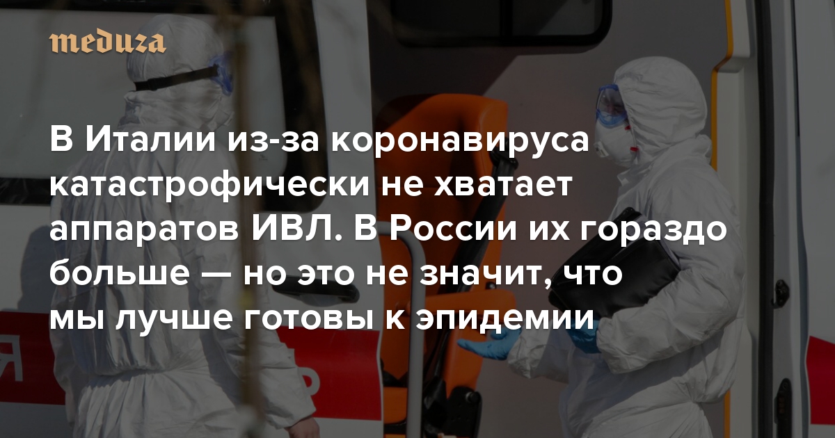 О том, выдержит ли российская система здравоохранения эпидемию коронавируса, можно отчасти судить по ситуации в Италии. Местные врачи, описывающие происходящее в больницах Ломбардии в терминах военного положения, отдельно отмечают нехватку аппаратов искусственной вентиляции легких (ИВЛ), которые в некоторых случаях требуются пациентам с коронавирусной инфекцией. Судя по данным, которые собрала «Медуза», в России с «вентиляторами» (как их называют врачи) все хорошо: по оснащенности аппаратами даже многие регионы, не говоря уже о Москве, значительно опережают западные страны. Впрочем, одних ИВЛ недостаточно, чтобы справиться с эпидемией: есть масса других факторов, в которых сравнение с Италией окажется не в пользу российского здравоохранения.