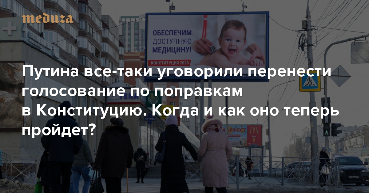 Владимир Путин перенес всероссийское голосование по поправкам к Конституции на неопределенный срок — об этом он заявил 25 марта во время обращения к нации, посвященного эпидемии коронавируса. «Медуза» еще на прошлой неделе писала, что президент России должен выступить с этим обращением и передвинуть дату голосования, хотя пресс-секретарь главы государства Дмитрий Песков тогда заверял, что «никакого обращения пока не готовится».
