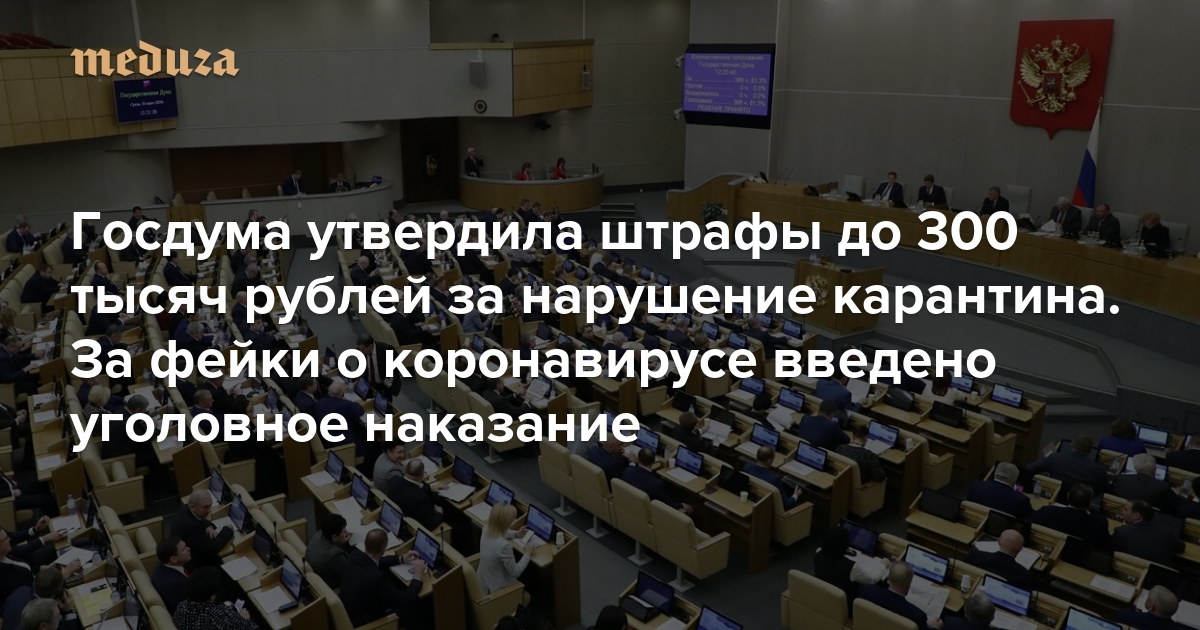 Госдума утвердила штрафы до 300 тысяч рублей за нарушение карантина За фейки о коронавирусе введено уголовное наказание