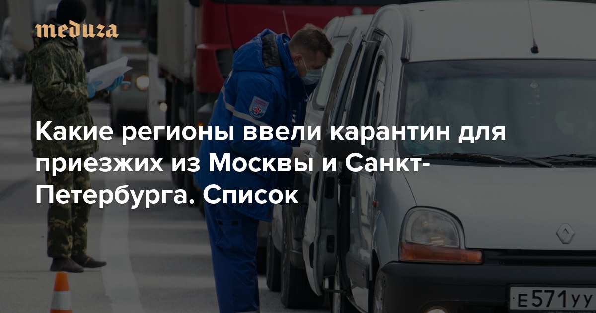 На фоне распространения коронавируса по России многие регионы начали вводить требования об обязательной самоизоляции на 14 дней прибывших из Москвы и Санкт-Петербурга — субъектов федерации, в которых зафиксировано больше всего случаев заболевания COVID-19. В случае прибытия авиарейсами граждан отправляют на самоизоляцию сразу из аэропорта (по месту жительства или пребывания или — при невозможности обеспечить там изоляцию — в обсерватор), при въезде в регион другим видом транспорта необходимо самостоятельно сообщить властям о своем прибытии. Ниже — обновляемый список регионов, которые уже ввели такие правила. Если рядом с регионом нет пометки в скобках, то самоизоляция необходима только прибывшим из Москвы и Санкт-Петербурга.