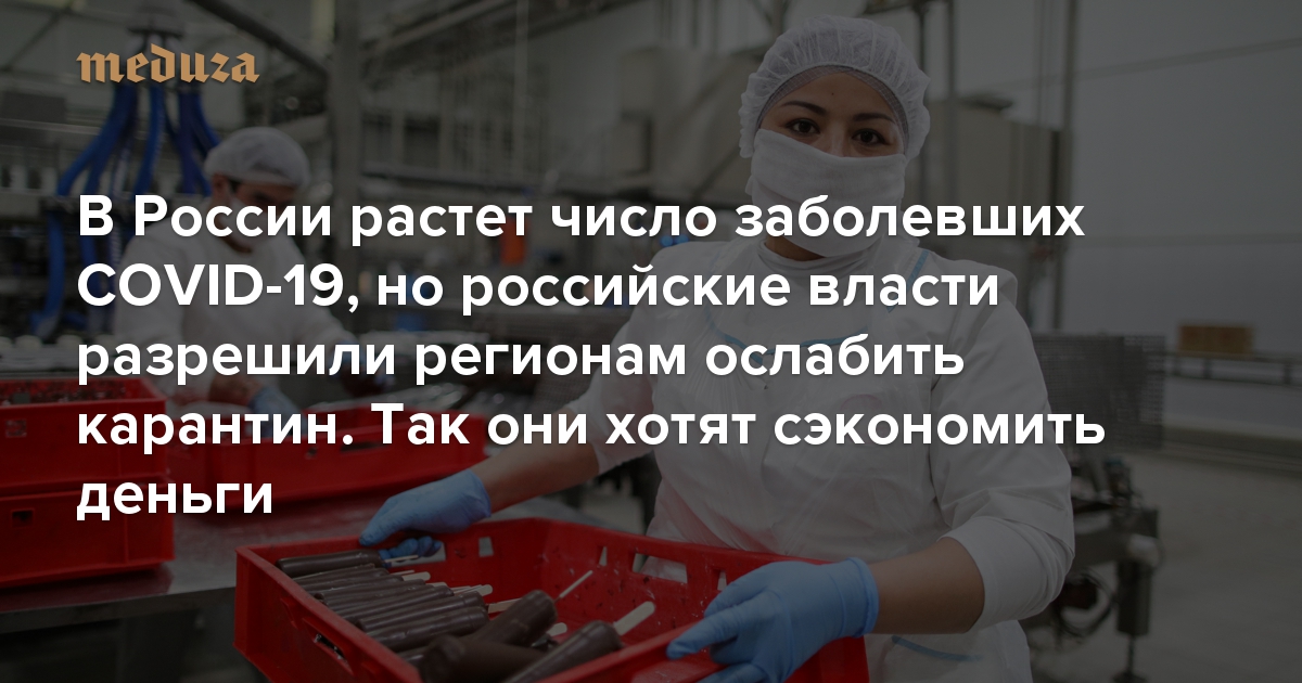 Российские регионы начали активно смягчать карантинные меры — несмотря на постоянный рост числа заболевших и признание мэра Москвы, главы рабочей группы Госсовета по борьбе с коронавирусом Сергея Собянина, что столица, центр эпидемии COVID-19 в стране, находится «у подножия» ее пика. В основном, послабления в регионах касаются производственных компаний, которые возобновляют работу. В некоторых регионах открываются даже кинотеатры, парикмахерские и солярии — при этом в Москве карантинные меры, наоборот, ужесточают. «Медуза» выяснила, что губернаторы руководствуются рекомендациями правительства: федеральный кабинет министров планирует постепенный выход из карантинного режима. Он уже начался на этой неделе, а на следующей вернутся к работе большинство крупных предприятий.
