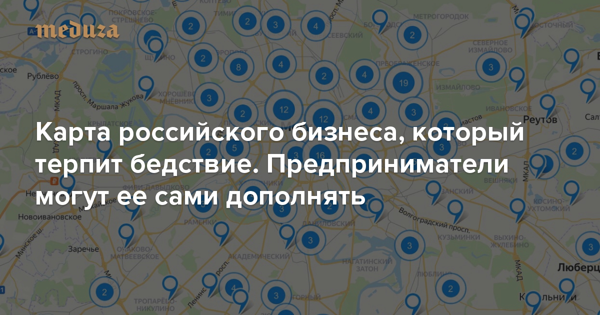 Бывший сотрудник российского Минфина Данил Махницкий 13 апреля запустил интерактивную карту российского бизнеса, находящегося на грани разорения из-за пандемии коронавируса и карантинных мер. Карта — часть кампании Махницкого за введение срочных мер поддержки малого и среднего бизнеса: его петицию на Change.org за обнуление налогов для этого сектора подписали уже более 280 тысяч человек. Более 3500 человек поделились своими историями в комментариях, рассказала «Медузе» руководитель коммуникаций Change.org в России Аня Айвазян.
