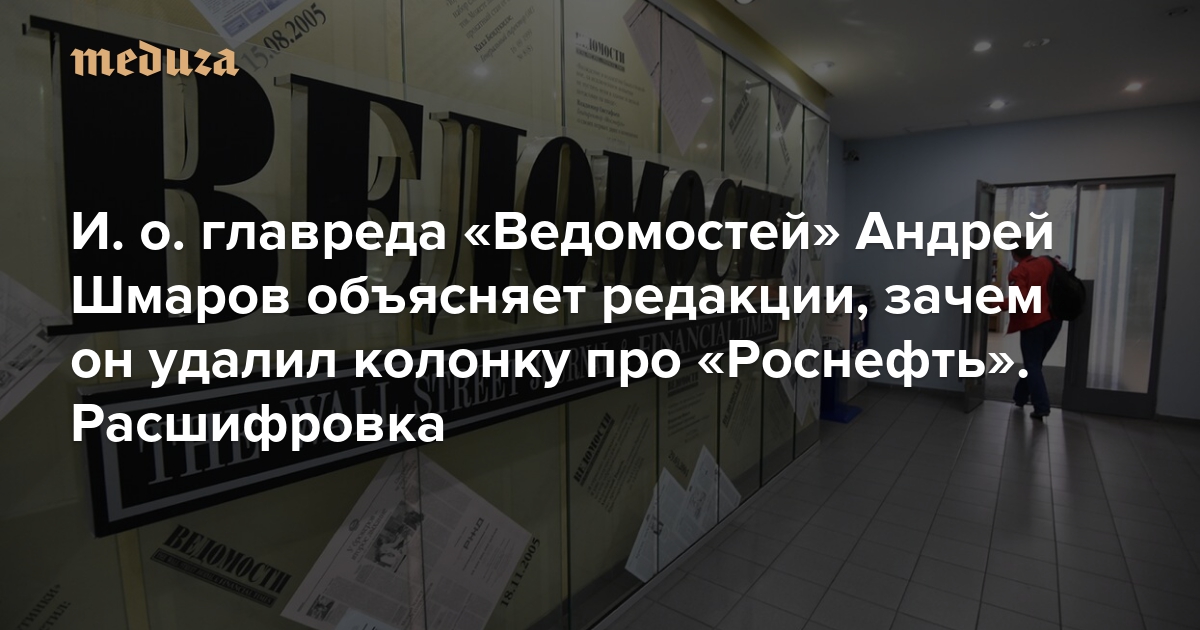 «Меня сюда уполномоченным поставили, чтобы это издание не было закрыто» И. о. главреда «Ведомостей» Андрей Шмаров объясняет редакции, зачем он удалил колонку про «Роснефть». Расшифровка