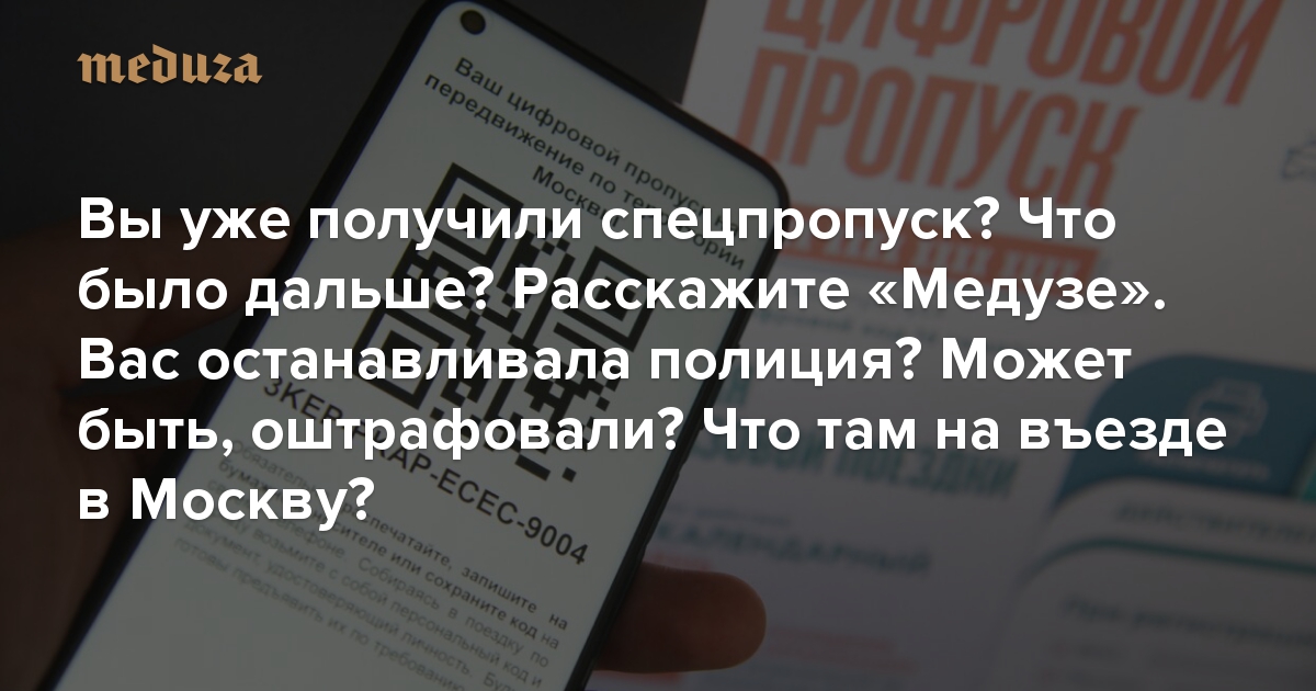Вы уже получили спецпропуск? Что было дальше? Расскажите «Медузе» Вас останавливала полиция? Может быть, оштрафовали? При въезде в Москву были проблемы?