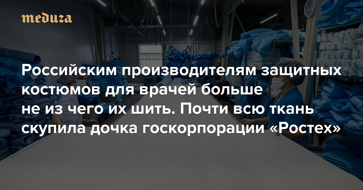 Но многие опрошенные «Медузой» компании-производители защитных костюмов жалуются на дефицит ткани, которая возникла из-за дочки «Ростеха» — корпорации «Росхимзащита». »«Росхимзащита» всасывает в себя как пылесос всю ткань на рынке, пользуясь административным ресурсом», — жалуется один из производителей. Из-за этого ряд компаний-производителей могут закрыться.