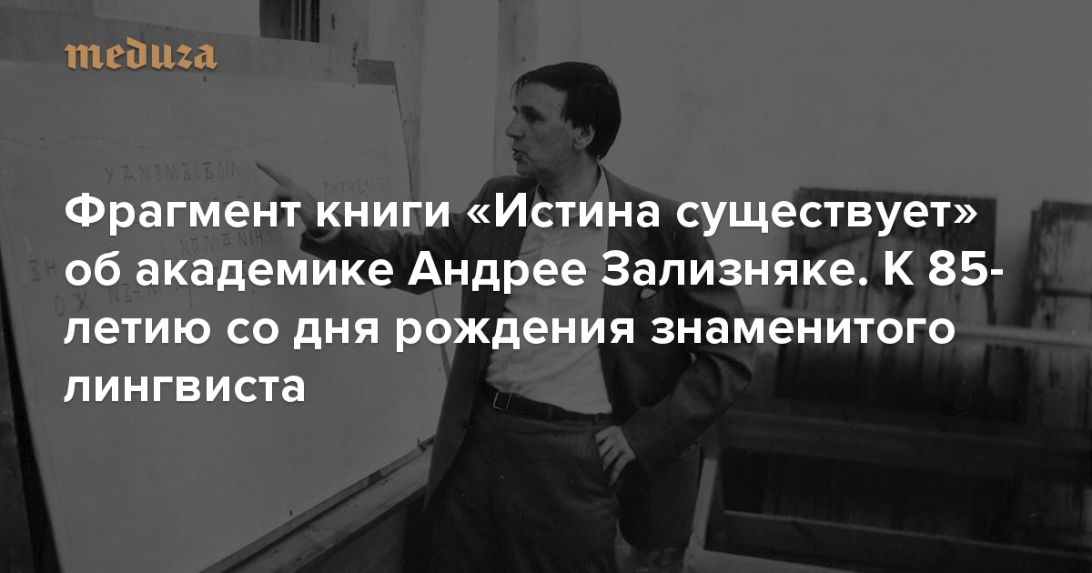 В издательстве Individuum вышла книга Марии Бурас «Истина существует: Жизнь Андрея Зализняка в рассказах ее участников». Автор — ученица и давний друг ученого — первой написала подробную биографию Зализняка с помощью воспоминаний его родственников, друзей, коллег и учеников. 29 апреля знаменитому лингвисту, который доказал подлинность «Слова о полку Игореве», исполнилось бы 85 лет. С разрешения издательства «Медуза» публикует главу «Отрыв от земли при взлете», в которой сам академик и его друзья рассказывают, как непросто ему давалось начало лекции — и с какой легкостью у него получалось ее продолжать.