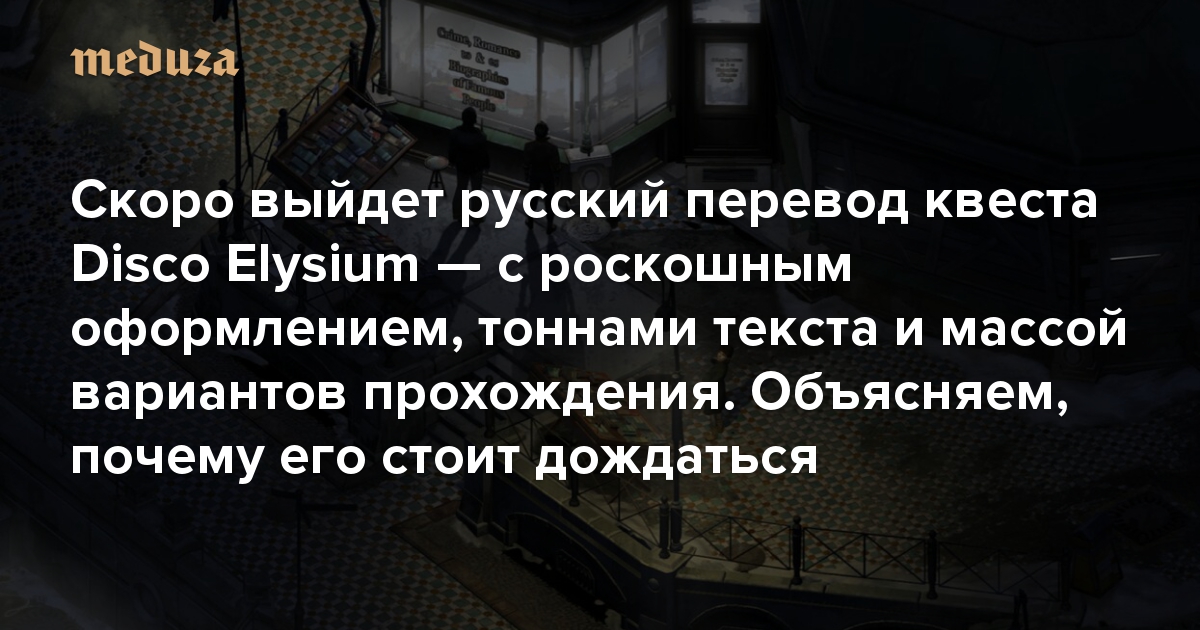 11 мая 2020 года стало известно, что одну из главных игр 2019-го, ролевой квест Disco Elysium, переведут на русский. Главным редактором русской локализации станет переводчица и иллюстратор Александра Голубева. Это отличная новость даже для тех, кто хорошо знает английский, потому что объем текста, который необходим для прохождения игры, одолеть довольно трудно. Игра уже вышла для Windows и MacOS, в будущем разработчики обещают версии для Nintendo Switch и консолей. Конкретную дату выхода русской версии Disco Elysium пока не объявили, но ее определенно стоит ждать. А пока объясняем, чем так хороша эта игра.