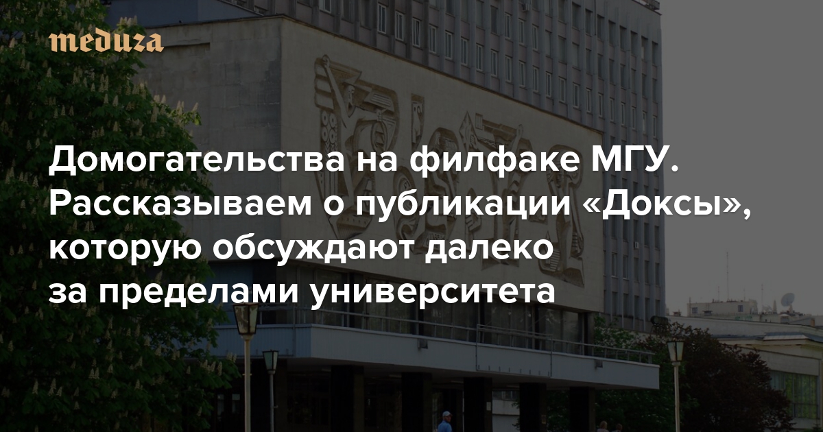 Героини текста «Доксы» — в основном выпускницы, а не нынешние студентки филфака; они анонимно рассказали, что в разные годы сталкивались с домогательствами со стороны преподавателей. Один из них, говорится в тексте, целовал студенток при всех; другой пригласил студентку на дачу, чтобы познакомить со своим отцом, но в итоге все закончилось сексом. В тексте не названы фамилии преподавателей, но в конце указано, что они находятся в распоряжении редакции и могут быть предоставлены руководству МГУ с согласия информанток.