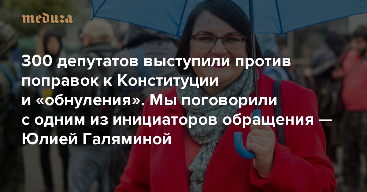 Около 300 (293) депутатов разных уровней — от регионального до муниципального — из разных регионов России подписались под обращением к гражданам, в котором выступили против поправок к Конституции. Авторы обращения и подписанты подчеркивают, что главная цель изменений в основном законе страны — «обнуление» сроков президента Владимира Путина (хотя формально поправки подаются как набор социальных и политических мер, включающих в себя гарантию индексации пенсий, защиту русского языка, запрет на иностранное гражданство для чиновников и прочее). Поправки «разрушают российское государство и создают угрозу самому его существованию уже в ближайшем будущем», — говорится в письме. «Медуза» поговорила с одним из инициаторов обращения — московским муниципальным депутатом Юлией Галяминой.