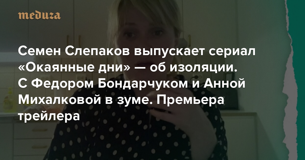 На платформе Premier 11 июня выходит новый screenlife-проект Семена Слепакова «Окаянные дни» — сборник историй об измене, деньгах и отдыхе во время изоляции. В сериале 10 эпизодов, которые сняли Андрей Болтенко, Ирина Вилкова, Петр Буслов, Максим Пежемский, Роман Волобуев и Владимир Епифанцев. В «Окаянных днях» сыграли Федор Бондарчук, Анна Михалкова, Павел Деревянко и другие. «Медуза» публикует трейлер сериала, а также комментарий Семена Слепакова об этом проекте.