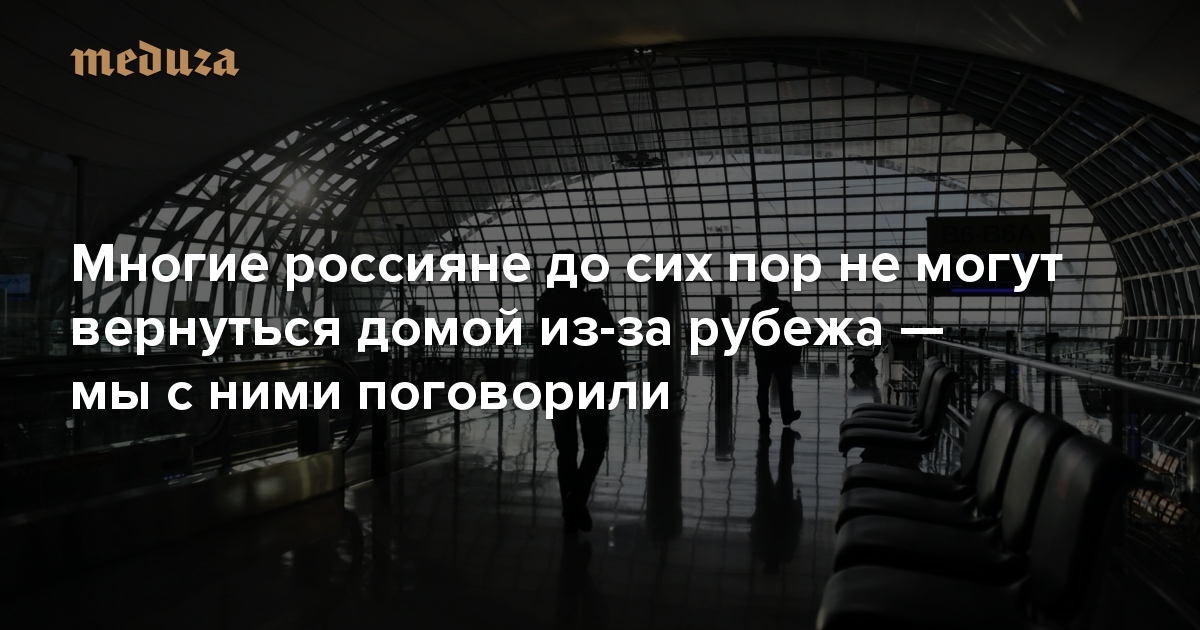 Многие россияне до сих пор не могут вернуться в страну из-за пандемии коронавируса. Бесплатная эвакуация и материальная помощь положены не всем, кто-то не может добраться до аэропорта из-за сложной логистики, в отдельных странах подходящих рейсов просто нет. «Медуза» поговорила с теми, кто застрял за границей.