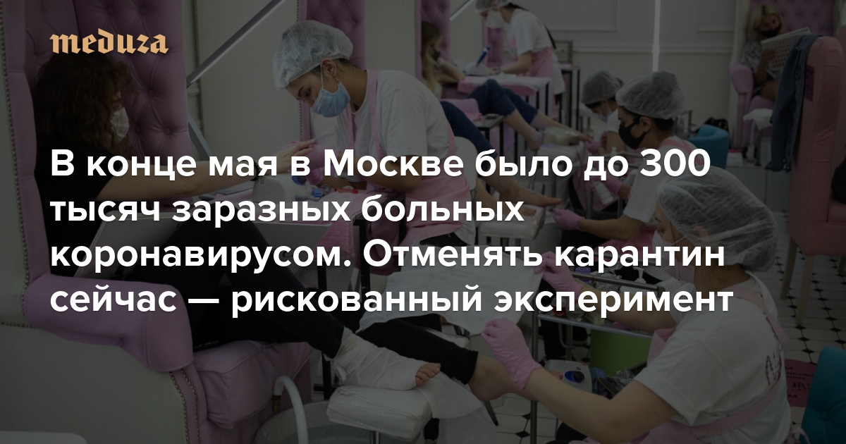 По подсчетам «Медузы», в конце мая в Москве было до 300 тысяч заразных больных коронавирусом. Отменять карантин сейчас — очень рискованный эксперимент