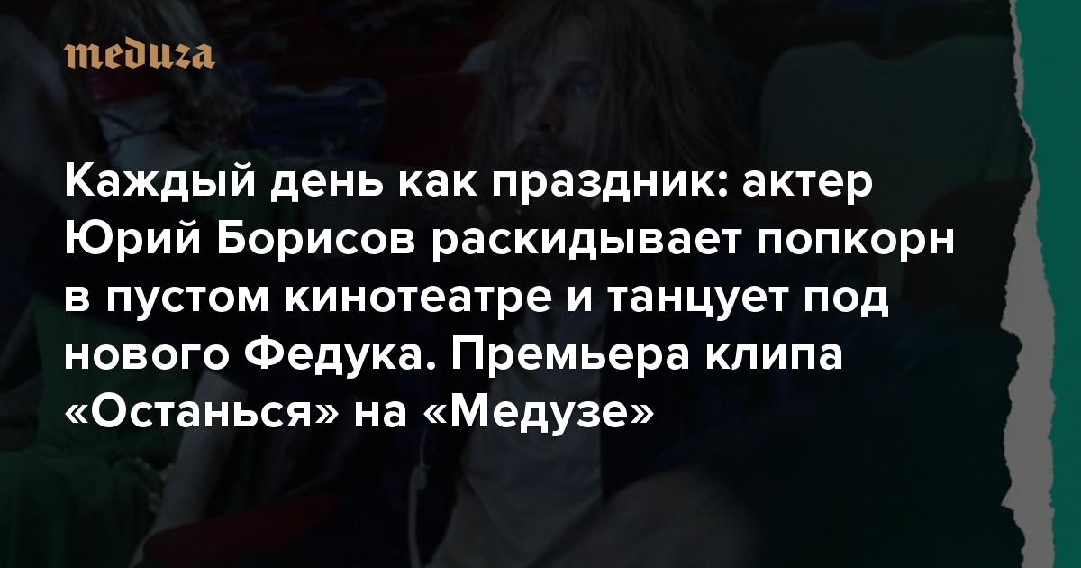 Каждый день как праздник: актер Юрий Борисов раскидывает попкорн в пустом кинотеатре и танцует под нового Федука Премьера клипа «Останься» на «Медузе»!