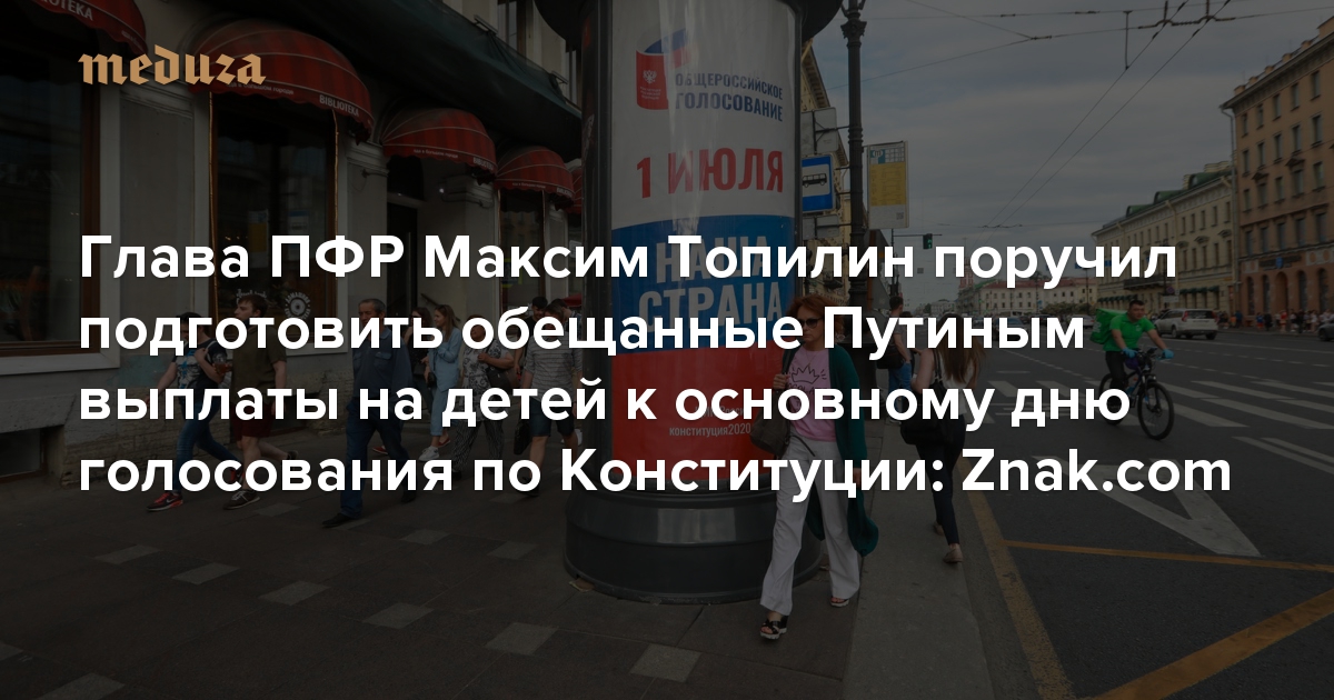 Znak.com опубликовал видеозапись с онлайн-совещания руководства Пенсионного фонда России (ПФР), которое прошло 23 июня. На совещании глава ПФР Максим Топилин поручил организовать начисление выплат на детей до 16 лет таким образом, чтобы деньги пришли на счета россиян утром 1 июля — в последний и основной день голосования по поправкам к Конституции.