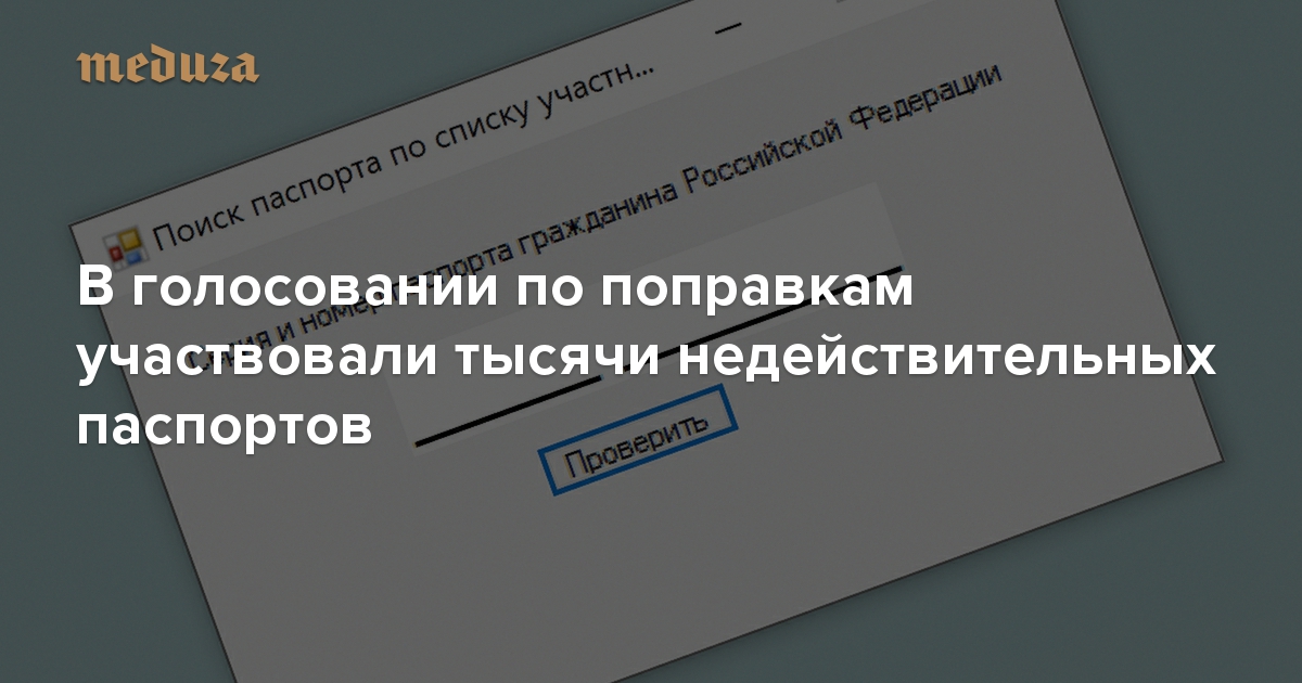 Более миллиона жителей Москвы и Нижегородской области проголосовали за поправки к Конституции или против них через интернет. «Медуза» выяснила, что паспортные данные этих избирателей лежали практически в открытом доступе. Более того, оказалось, что некоторые интернет-избиратели были записаны в системе дважды, а другие смогли проголосовать, хотя их паспорта МВД считает недействительными. Мы опубликовали список недействительных паспортов, а также простую инструкцию, чтобы вы могли сами проверить нашу находку.