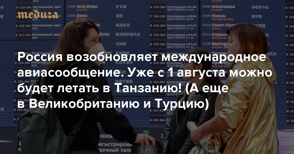 Пока договоренности об авиасообщении достигнуты только с тремя странами — Великобританией, Турцией и Танзанией. При этом с Танзанией ранее у России не было прямого авиасообщения — неясно, появится ли оно теперь. В случае Турции с 1 августа возобновятся регулярные рейсы в Анкару и Стамбул, а с 10 августа можно будет летать на курорты — в Анталию, Бодрум и Даламан. В случае с Великобританией на первом этапе начнутся рейсы в Лондон — при этом в правительстве РФ напомнили, что эта страна требует от прибывающих в обязательном порядке отправляться на 14-дневную изоляцию (в Турции и Танзании таких требований нет). Вице-премьер Татьяна Голикова отметила, что список стран в ближайшее время будет расширяться. Глава Минтранса Евгений Дитрих пояснил, что сейчас Россия ведет переговоры с 30 странами.