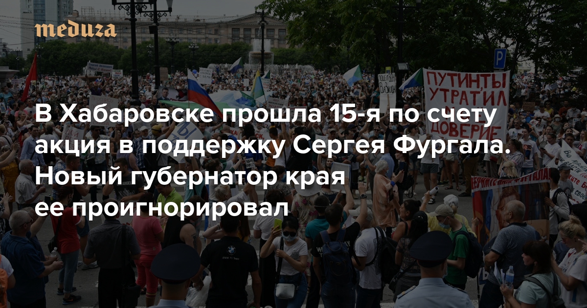 В Хабаровске прошла 15-я по счету несанкционированная акция в поддержку бывшего губернатора края Сергея Фургала. Как и во время предыдущих акций, жители города собрались на площади Ленина, прошли шествием по центральным улицам и снова вернулись на площадь. Они скандировали лозунги «Свободу», «Пока мы едины — мы непобедимы», «Это наш край», а также «Долой царя», «Россия, просыпайся» и «Путина в отставку». Также появилось много лозунгов против нового губернатора Хабаровского края Михаила Дегтярева, например, «Чемодан — вокзал — Самара» и «На чужой край рот не разевай». Акция продолжалась около четырех часов. Полиция митингующим не препятствовала.