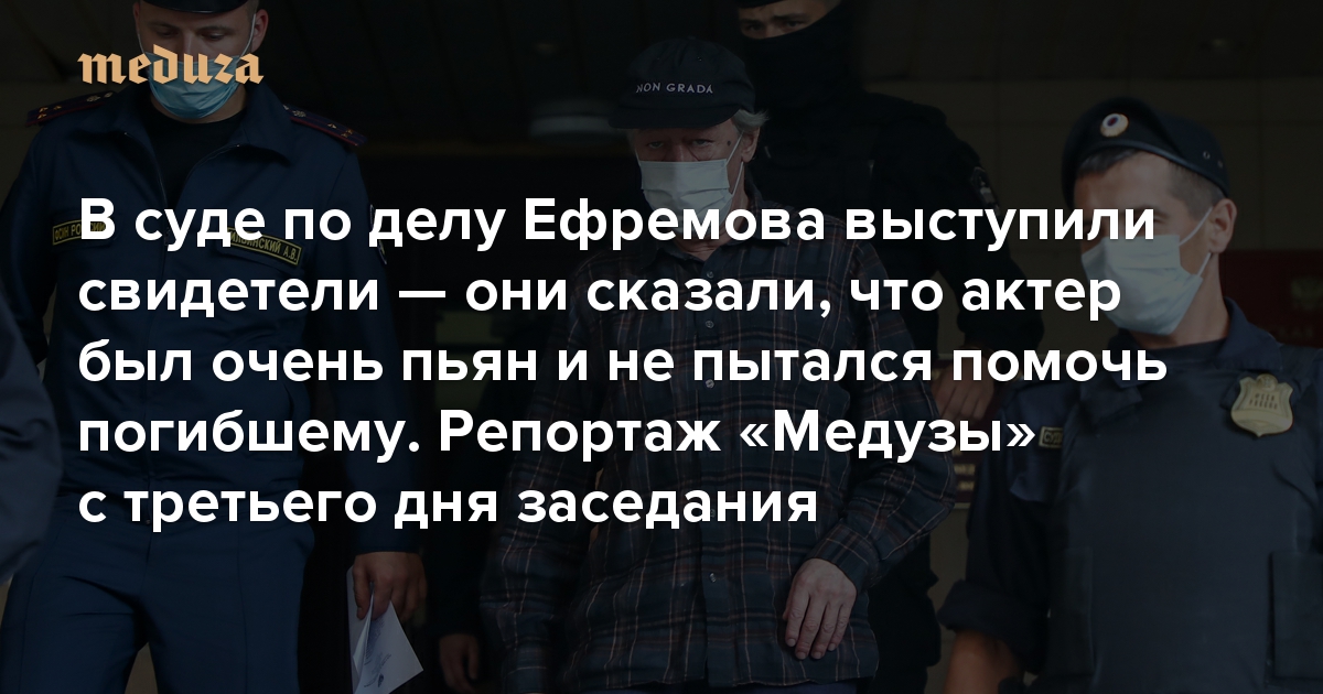 «Он стоял и жалел свой автомобиль» В суде по делу Ефремова выступили свидетели — они сказали, что актер был очень пьян и не пытался помочь погибшему. Репортаж «Медузы» с третьего дня заседания