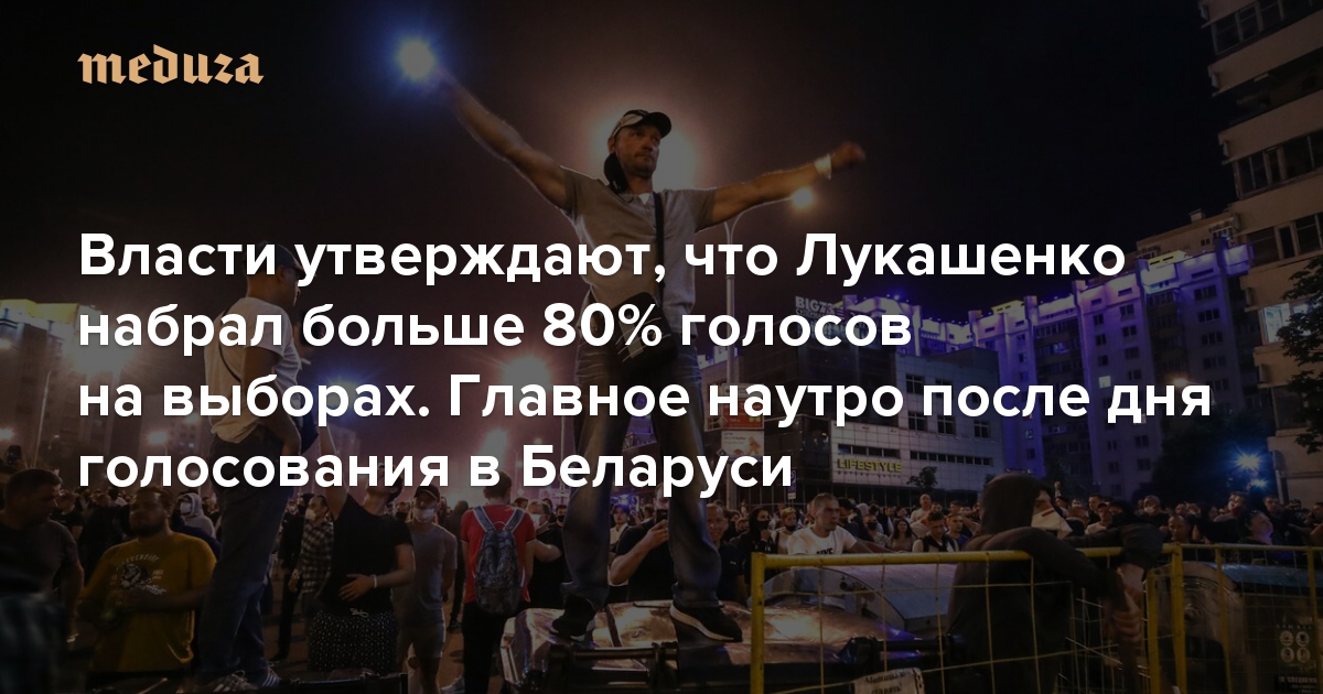 Власти утверждают, что Лукашенко набрал больше 80% голосов на выборах. В ходе протестов погиб человек, среди пострадавших спецкор «Медузы» Максим Солопов Главное о ночи после выборов