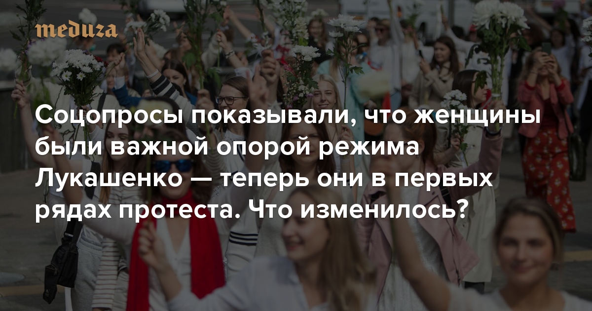 С середины этой недели среди протестующих в Минске и других городах — по крайней мере, визуально — стали преобладать женщины всех возрастов: с цветами и белыми воздушными шарами они вставали в живые цепи на обочинах дорог. Эта новая тактика протеста совпала с резким отступлением силовиков — задержания и избиения протестующих почти прекратились, из изоляторов начали отпускать избитых граждан. Еще раньше люди сплотились вокруг «женского триумвирата» и Светланы Тихановской, которая, не имея никакого опыта в политике, провела эффектную и воодушевляющую кампанию (и, как настаивает оппозиция, выиграла выборы). Женский протест, таким образом, стал ключевым символом нынешнего оппозиционного движения. А ведь еще недавно даже независимые опросы показывали, что многие женщины, особенно старшего поколения, были одной из главных опор «стабильности» и самого режима Александра Лукашенко. «Медуза» изучила социологические данные и попыталась понять, что изменилось.