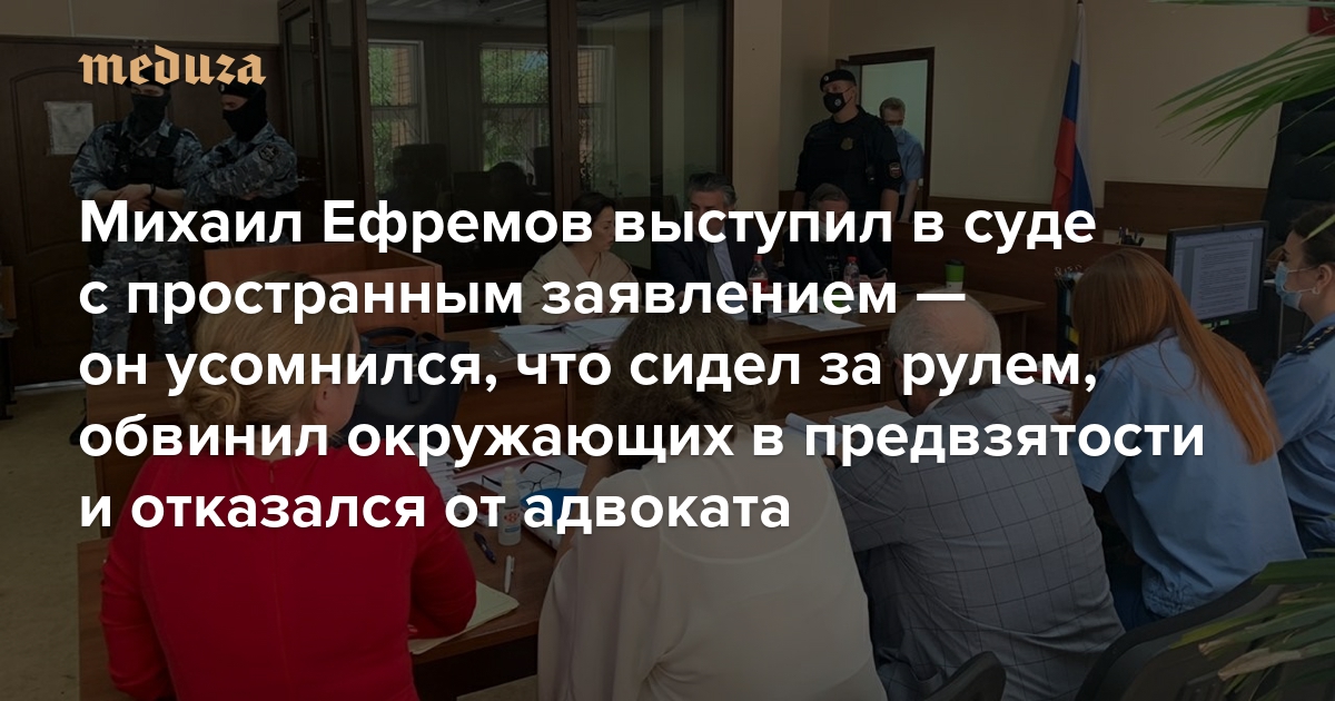 21 августа в Пресненском суде состоялось очередное заседание по делу Михаила Ефремова. Он обвиняется в том, что в пьяном виде стал виновником аварии на Садовом кольце, в результате которой погиб 57-летний курьер Сергей Захаров. На этот раз актер отказался от своих защитников. Адвокаты потерпевшей стороны считают, что это попытка оттянуть допрос Ефремова, прения и приговор. Актер вновь заявил, что ничего не помнит, но склоняется к тому, что не сидел за рулем в тот день. За судебным заседанием наблюдала спецкор «Медузы» Анастасия Якорева.