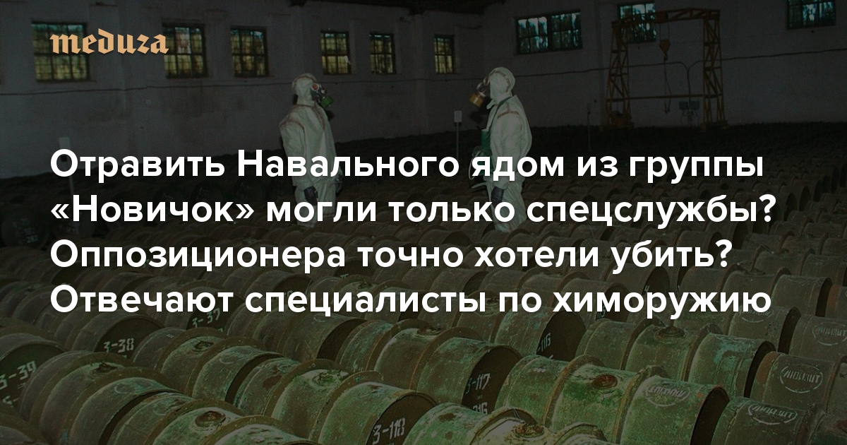 Правительство Германии 2 сентября заявило, что основателя Фонда борьбы с коррупцией Алексея Навального отравили нервно-паралитическим веществом из группы «Новичок». Канцлер Ангела Меркель сказала, что Навальный стал жертвой преступления — по ее мнению, оппозиционера пытались «заставить замолчать»; Москва говорит, что такие заявления не подкреплены фактами. Самый главный и остро обсуждаемый вопрос после возникновения в этой истории «Новичка» можно сформулировать так: означает ли применение химического оружия, что за преступлением точно стоят российские спецслужбы? «Медуза» попросила ответить на него самих специалистов по химоружию.