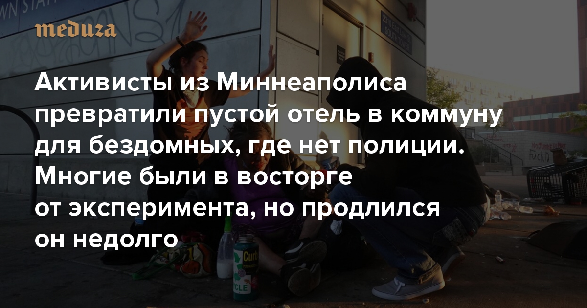 В конце мая из-за убийства Джорджа Флойда в США начались массовые протесты против расизма и полицейского насилия. На их фоне появились предложения сократить штат полиции или вовсе распустить ее. Левые активисты из Миннеаполиса — города, где убили Флойда, — решили воплотить в жизнь идею об упразднении полиции. Они заняли местный отель и организовали там бесплатное убежище для бездомных. По их замыслу, оно должно было превратиться в самоуправляемую коммуну, члены которой сами могут предотвратить насилие. Но через 10 дней убежище пришлось закрыть: его обитатели начали открыто принимать наркотики и торговать секс-услугами. О том, как начался и закончился этот эксперимент, рассказал американский журнал Harperʼs Magazine.