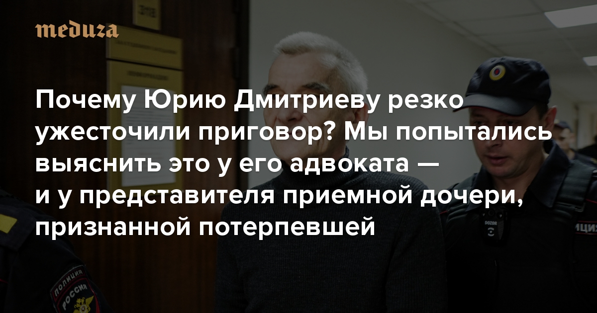 Почему Юрию Дмитриеву так сильно и резко ужесточили приговор — до 13 лет колонии строгого режима? Мы попытались выяснить это у его адвоката — и у представителя приемной дочери, признанной потерпевшей