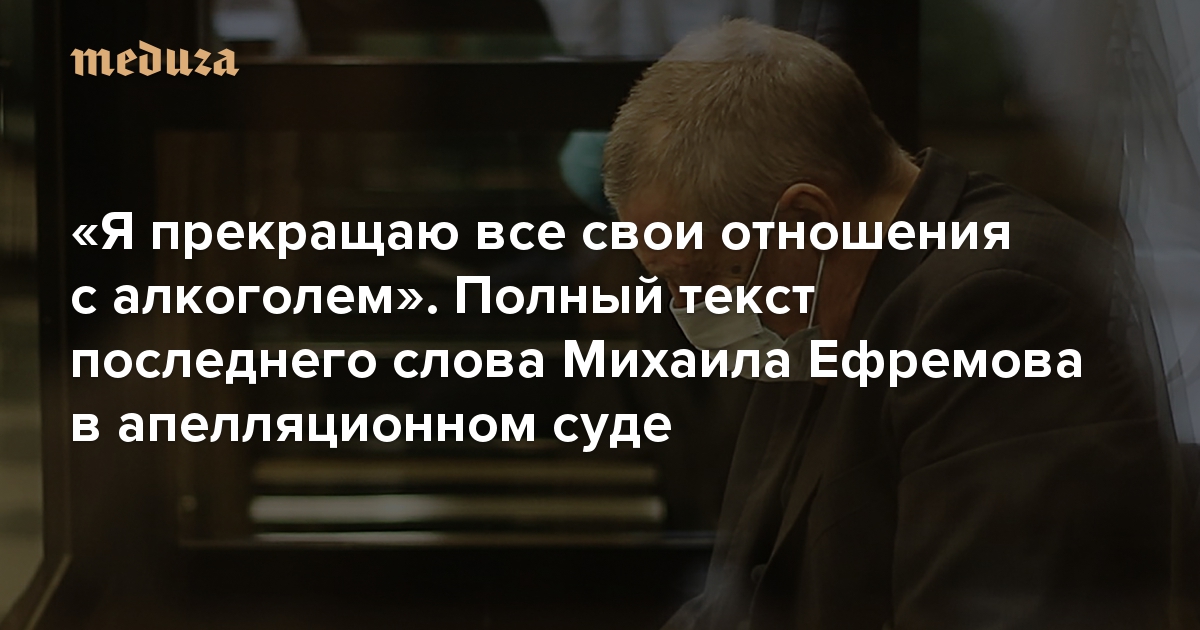 «Я прекращаю все свои отношения с алкоголем» Михаил Ефремов выступил в апелляционном суде, который на полгода снизил ему срок. Полный текст последнего слова актера