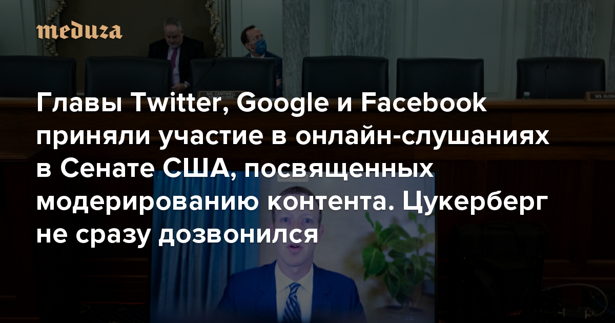 Главы Twitter, Google и Facebook приняли участие в онлайн-слушаниях в Сенате США, посвященных модерированию контента. Цукерберг не сразу дозвонился