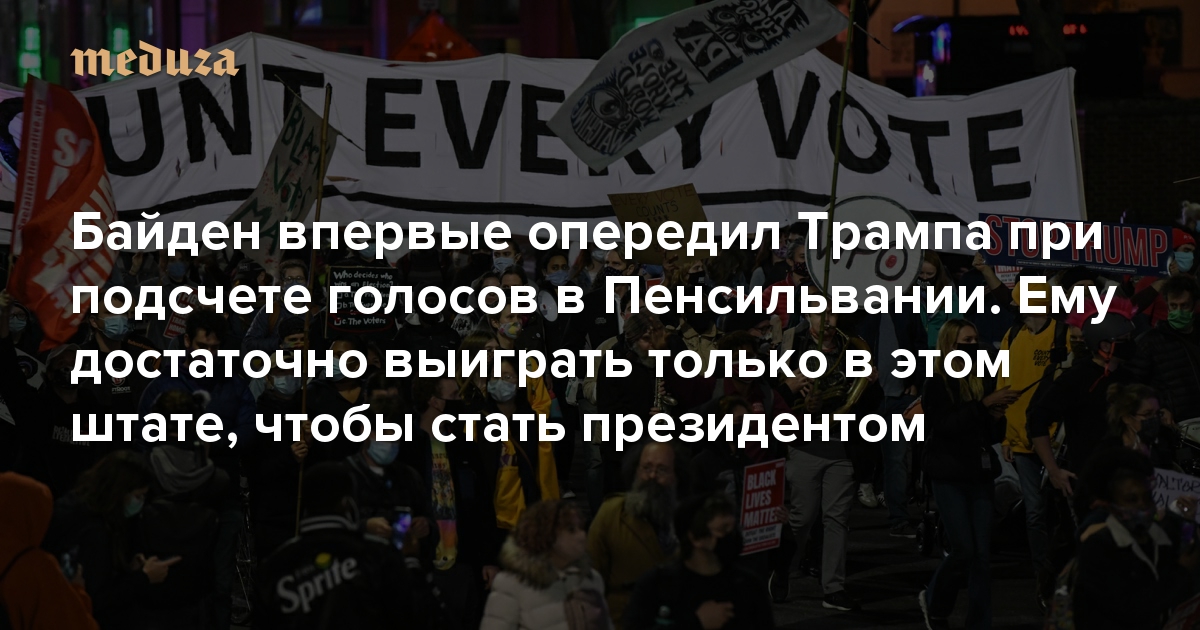 На момент публикации этого текста (после подсчета 95% голосов) Байден набирает 49,4%, действующий президент Дональд Трамп — 49,3%. Абсолютная разница между претендентами составляет около семи тысяч голосов (всего в Пенсильвании более 9 миллионов избирателей).