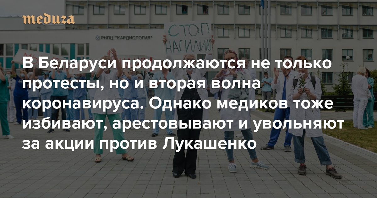 Протесты в Беларуси продолжаются уже больше трех месяцев. Настроенных оппозиционно к Лукашенко белорусов регулярно избивают, арестовывают и штрафуют на крупные суммы. В числе пострадавших как минимум несколько сотен медиков, утверждают общественные организации. Одновременно врачи пытаются бороться со второй волной пандемии коронавируса: только по официальной статистике, в стране ежедневно заболевает порядка 1500 человек. Сами медики говорят, что на деле заразившихся на порядок больше. «Медуза» рассказывает, как белорусское государство преследует медиков в разгар эпидемии.