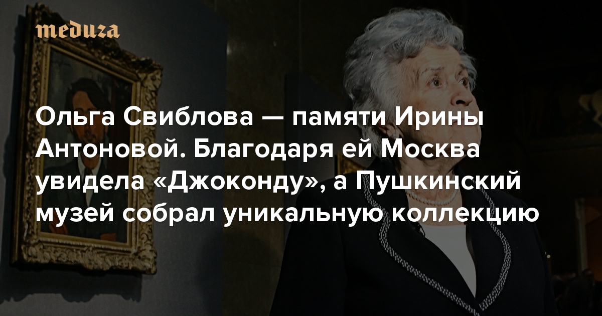 Вечером 30 ноября умерла Ирина Антонова — президент Государственного музея изобразительных искусств (ГМИИ) имени Пушкина. Ей было 98 лет. В музее подтвердили, что причиной смерти стал коронавирус в сочетании с другими заболеваниями. Антонова начала работать в Пушкинском в 1945 году, с 1961-го по 2013-й была его директором, после чего ее место заняла Марина Лошак; Антонова стала президентом музея — этот пост учредили специально для нее. Именно при Антоновой Москва впервые увидела «Мону Лизу» Леонардо да Винчи — картину привезли в Пушкинский музей в 1974 году. Во время ее руководства в музее также прошли важнейшие выставки «Москва — Париж. 1900–1930» (1981), «Москва — Берлин. 1900–1950» (1996), «Сокровища Трои из раскопок Генриха Шлимана» (1996), «Пикассо» (2010) и другие. По просьбе «Медузы» искусствовед и директор московского «Мультимедиа Арт Музея» Ольга Свиблова вспоминает Ирину Антонову — и то, как она повлияла на советское и российское искусство.