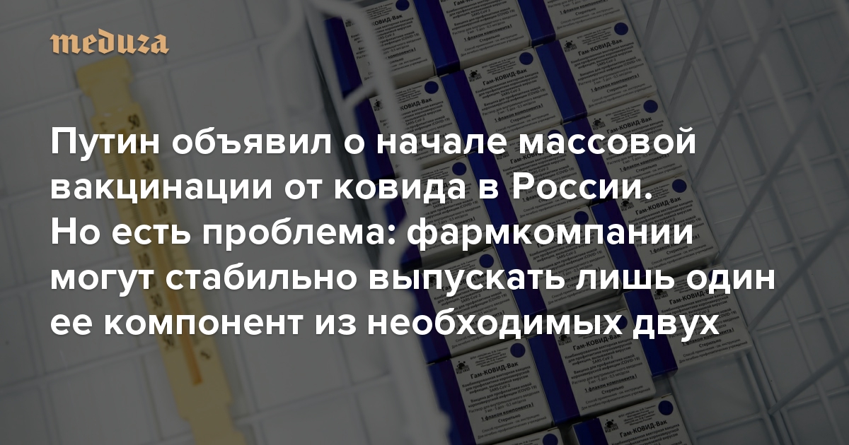 Президент России Владимир Путин в начале недели пообещал, что в ближайшие дни в России произведут два миллиона доз первой отечественной вакцины «Спутник V». Массовая вакцинация в стране должна начаться на следующей неделе, в Москве — уже в субботу, 5 декабря. Однако, как выяснила «Медуза», с вакцинацией могут возникнуть сложности, о которых раньше не было широко известно: в России выпущено много первого компонента вакцины, но фармкомпании пока не могут наладить стабильное производство второго. Без него вакцинацию можно начать, но нельзя — закончить.