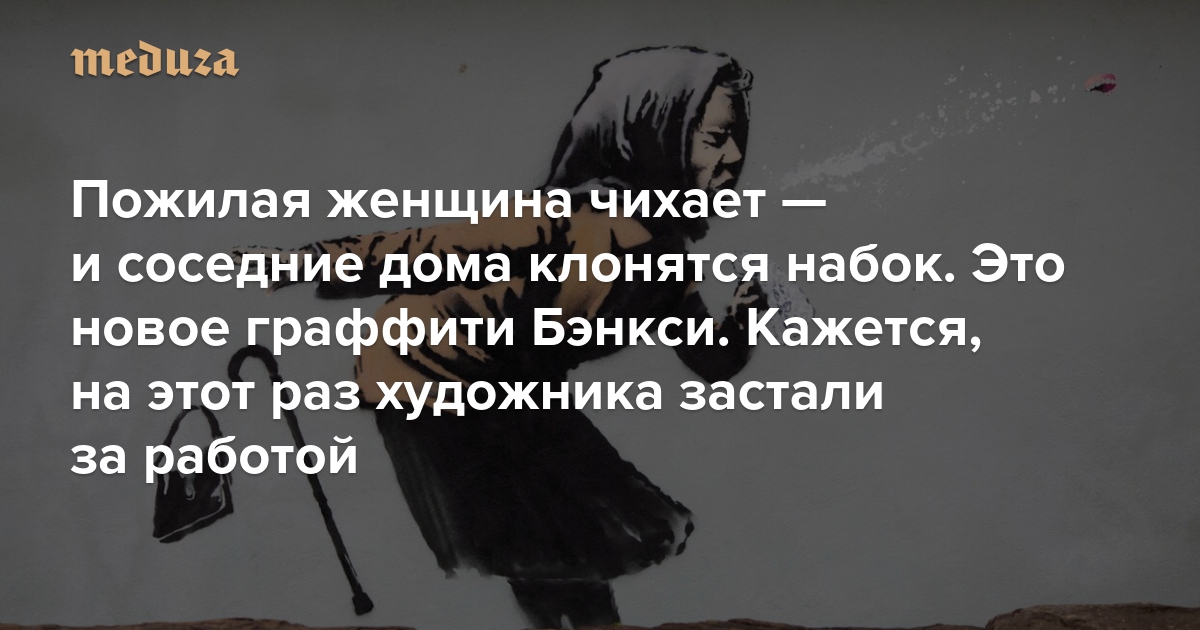 Пожилая женщина чихает — и соседние дома клонятся набок. Это новое граффити Бэнкси Кажется, на этот раз художника застали за работой