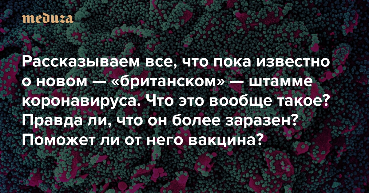 Рассказываем все, что пока известно о новом — «британском» — штамме коронавируса Что это вообще такое? Есть ли этот штамм в России? Правда ли, что он более заразен? Поможет ли от него вакцина?