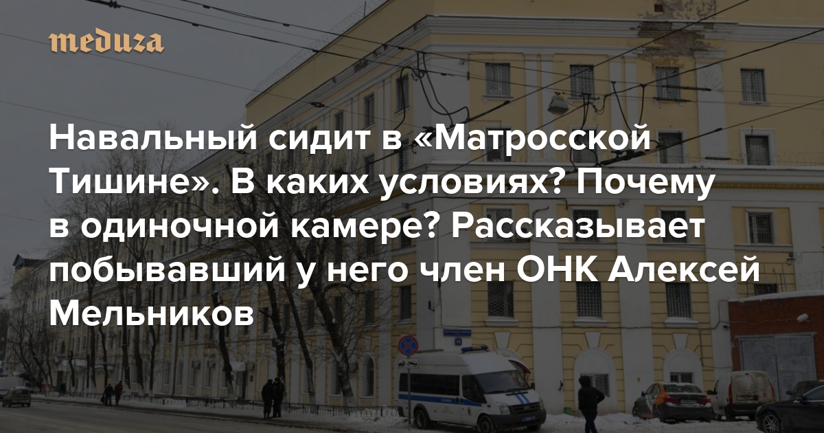 Алексея Навального, задержанного сразу по возвращении в Россию до 15 февраля, держат в московском следственном изоляторе «Матросская Тишина». Правозащитник и ответственный секретарь Общественной наблюдательной комиссии Москвы Алексей Мельников первым навестил политика в его одиночной камере и рассказал «Медузе» об условиях, порядках и правилах заключения для Навального.