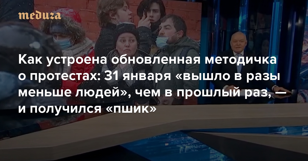 Российские телеканалы и информагентства в день акций протеста 31 января сообщили о «в разы снизившемся» числе их участников. В сюжетах на государственном ТВ при этом показали кадры из тех городов, где протестная активность традиционно низка либо на митинги вышло действительно мало людей. «Это пшик», — заявил в «Вестях недели» главный российский пропагандист Дмитрий Киселев. Однако федеральные каналы не объяснили, как при такой низкой численности протестующих силовикам удалось поставить очередной рекорд задержаний — пять тысяч человек.