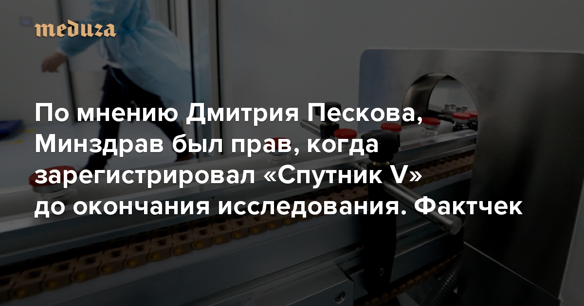 По мнению Дмитрия Пескова, Минздрав был прав, когда зарегистрировал «Спутник V» до окончания исследования. Но это противоречит логике Фактчек «Медузы»