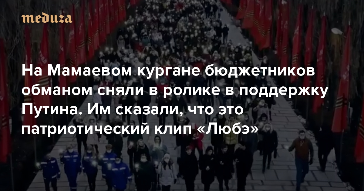 В Волгограде учителей, врачей и других работников бюджетной сферы собрали на Мамаевом кургане и сняли в клипе в поддержку Владимира Путина. Как пишет издание V1.ru, многие приглашенные на съемки в добровольно-принудительном порядке были уверены, что принимают участие в клипе группы «Любэ». Съемки прошли 4 февраля.