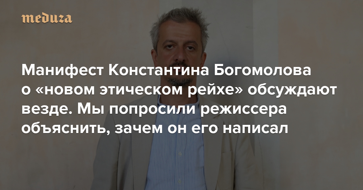 «Новая газета» 10 февраля опубликовала текст «Константин Богомолов. Похищение Европы 2.0» — это манифест режиссера, в котором он рассуждает о новой этике, называя ее «новым этическим рейхом». Богомолов также пишет о расовом равноправии, «сексуальной контрреволюции» и других процессах, идущих, по его мнению, сегодня в западном обществе. «Благодаря стечению обстоятельств мы оказались в хвосте безумного поезда, несущегося в босховский ад, где нас встретят мультикультурные гендерно-нейтральные черти», — написал режиссер. В соцсетях текст много обсуждали и критиковали — Богомолов даже попал в тренды российского твиттера. Специальный корреспондент «Медузы» Светлана Рейтер спросила Богомолова, зачем он написал этот манифест и как он относится к слухам о том, что настоящий автор текста — Владислав Сурков.